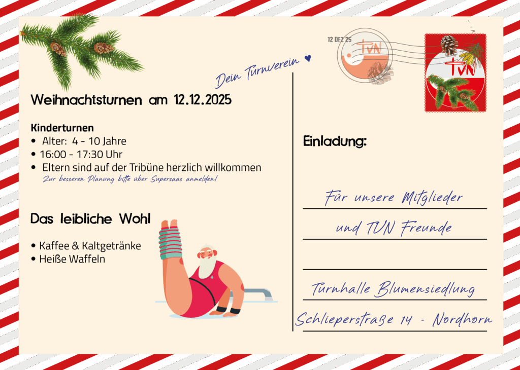 Weihnachtsturnen am 12. Dezember 2025 Schlagwörter: Kinder, Nordhorn, Turnen Weitere Artikel ansehen Vorheriger BeitragStellenausschreibung: Sport- & Gymnastiklehrer/in Das könnte dir auch gefallen Kinderyoga Kurs ab 23.10.24 September 24, 2024 Neuer Kurs: MAMI-FIT Februar 20, 2024 Neuer Schwimmkurs für Anfänger – Anmeldung ab 21.12.2022 ab 12:00 Uhr August 9, 2022 Schreibe einen Kommentar Antwort abbrechenKommentierenGib deinen Namen oder Benutzernamen zum Kommentieren ein Gib deine E-Mail-Adresse zum Kommentieren ein Gib deine Website-URL ein (optional) Meinen Namen, meine E-Mail-Adresse und meine Website in diesem Browser für die nächste Kommentierung speichern.